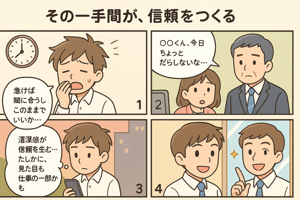 身だしなみは、ビジネスの場面では一番基本とされるところですが、「まあいいか」「今日はこのぐらいで…」などとさぼってしまいがちです。