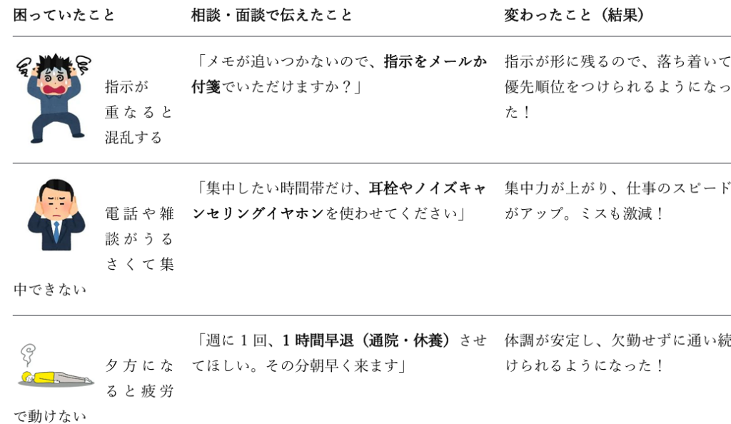 • 外部支援者の活用:自分一人で伝えるのが難しい場合は、ジョブコーチや就労定着支援事業所の支援員に面談へ同席してもらうことも可能です。