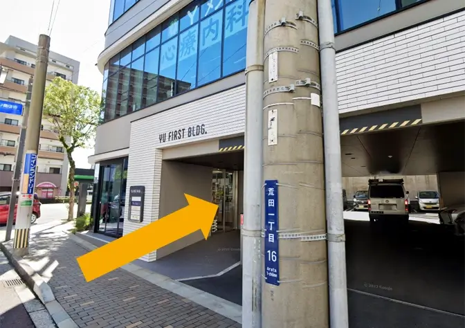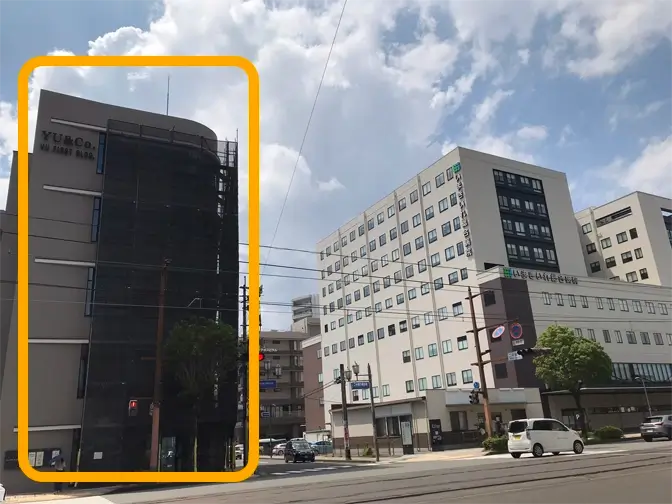 いまきいれ総合病院から二中通商店街を挟んですぐのビル(YU FIRST BLDG.)です