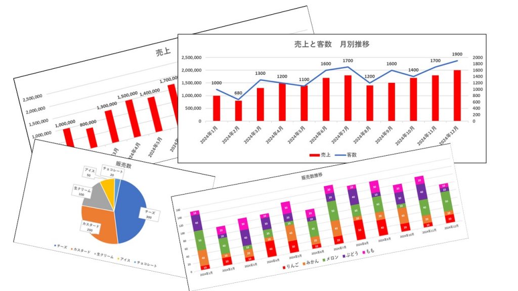 毎月の販売数や客数の推移など、Excelの表だけでは数字の記載しかないのでわかりづらいですが、グラフをつけると毎月の推移も一目瞭然ですよね♪