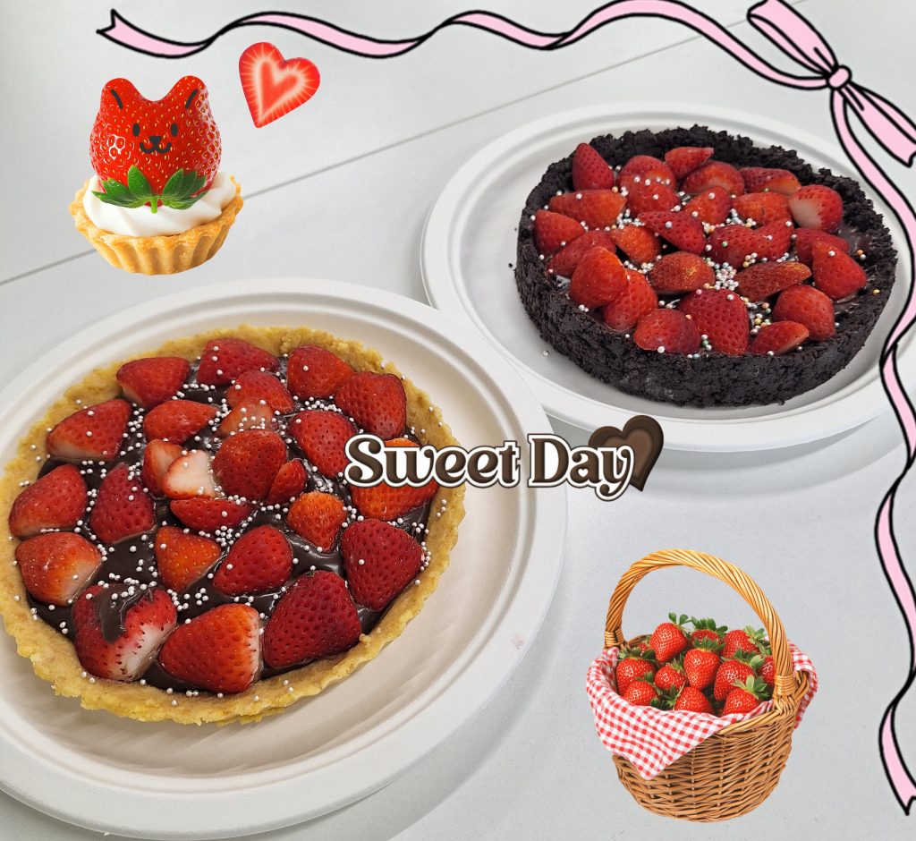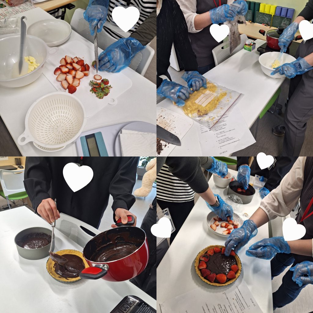 本日は『苺のチョコタルト作り🍓』を実施しました!作業手順を話し合い、楽しみながら作業しました✨タルトを切り分ける時には、どう切り分ければ均等になるか、、カットを担当する方は緊張しますが、皆さんでサポートし合いながらカットされていました🍫