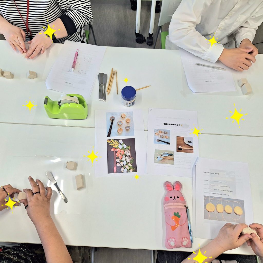今回は石粉粘土というアクセサリーや小物、フィギュア作りに適しいている粘土を使用しました✨数日乾燥させたあと、色付けとコーティングを行います☺️皆さん工夫しながら手先を使って楽しみながら作業されていました😆!