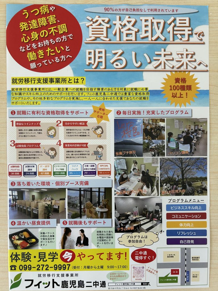 フィット鹿児島二中通 新しいチラシできました! | 鹿児島県鹿児島市の就労移行支援事業所 ティオ鹿児島中央・ティオ児島二中通(旧:フィット鹿児島中央・フィット鹿児島二中通)