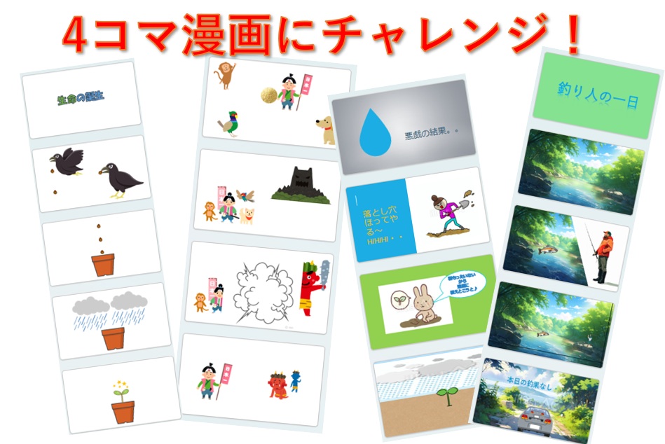 普通の4コマ漫画ではなく、今回はパワーポイントを使用してアニメーションを付けた4コマ漫画にチャレンジしました♪