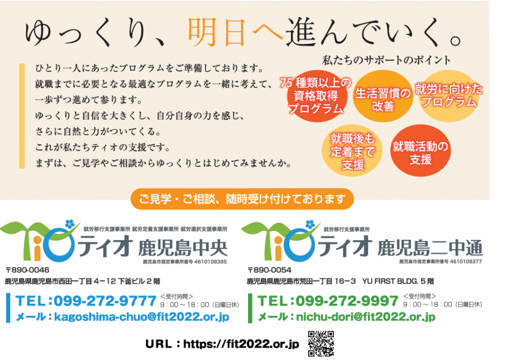 就労移⾏⽀援ティオ⿅児島中央・鹿児島二中通は⼀般社団法⼈社会福祉⽀援研究機構に加盟しております。