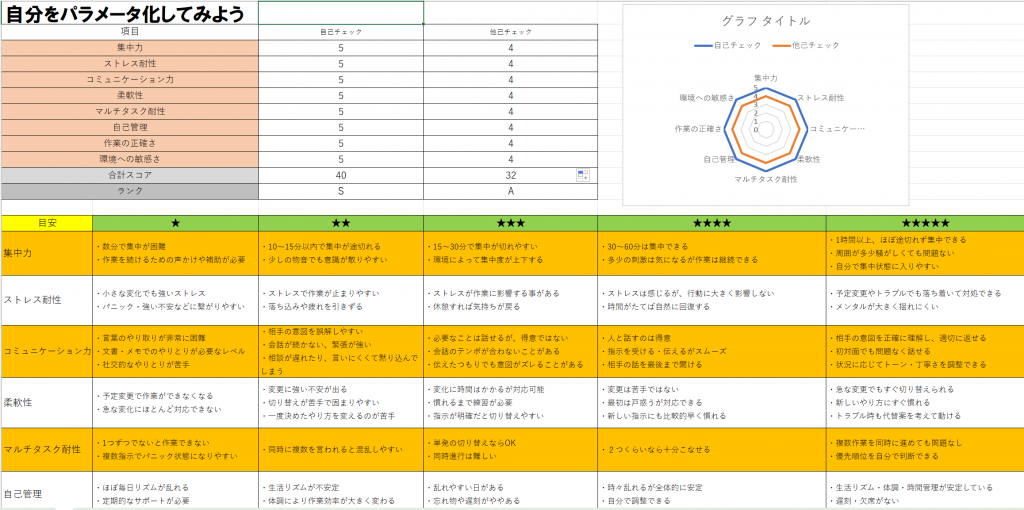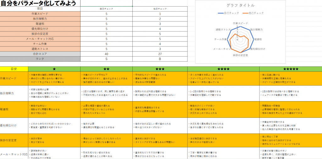 自己チェックと他己チェックを行う事で、自分視点と他者視点での違いが見えました。