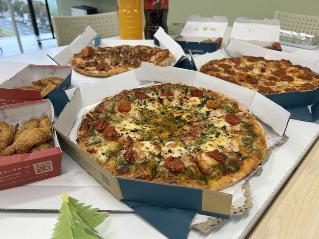 お昼には、ピザとチキンをデリバリーし、みなさんでテーブルを囲んでのランチタイム🍕🍗。