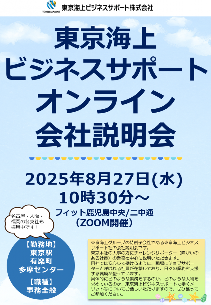 【2025年8月27日】東京海上ビジネスサポートの会社説明会が開催されます!