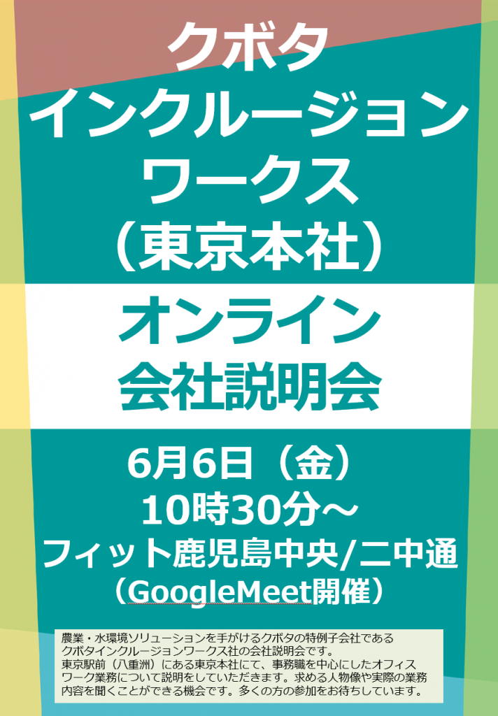 【2025年6月6日】クボタインクルージョンワークスの会社説明会が開催されます!