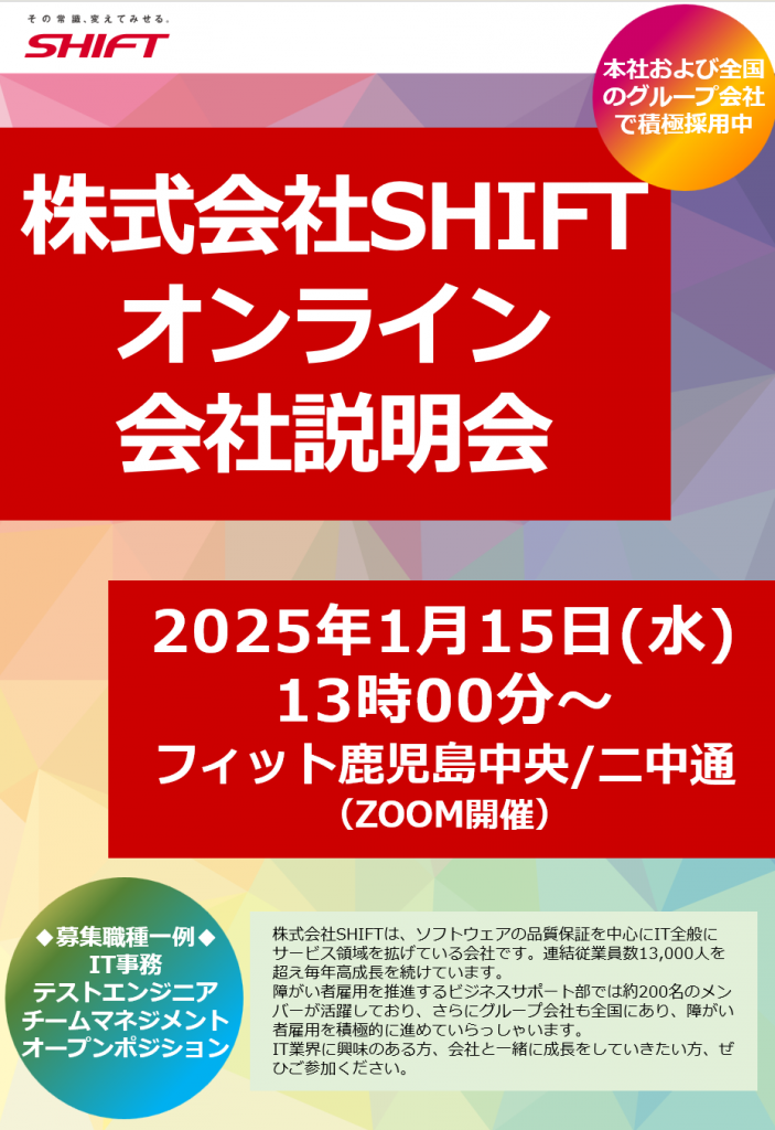 【2025年1月15日】株式会社SHIFTの会社説明会が開催されます!