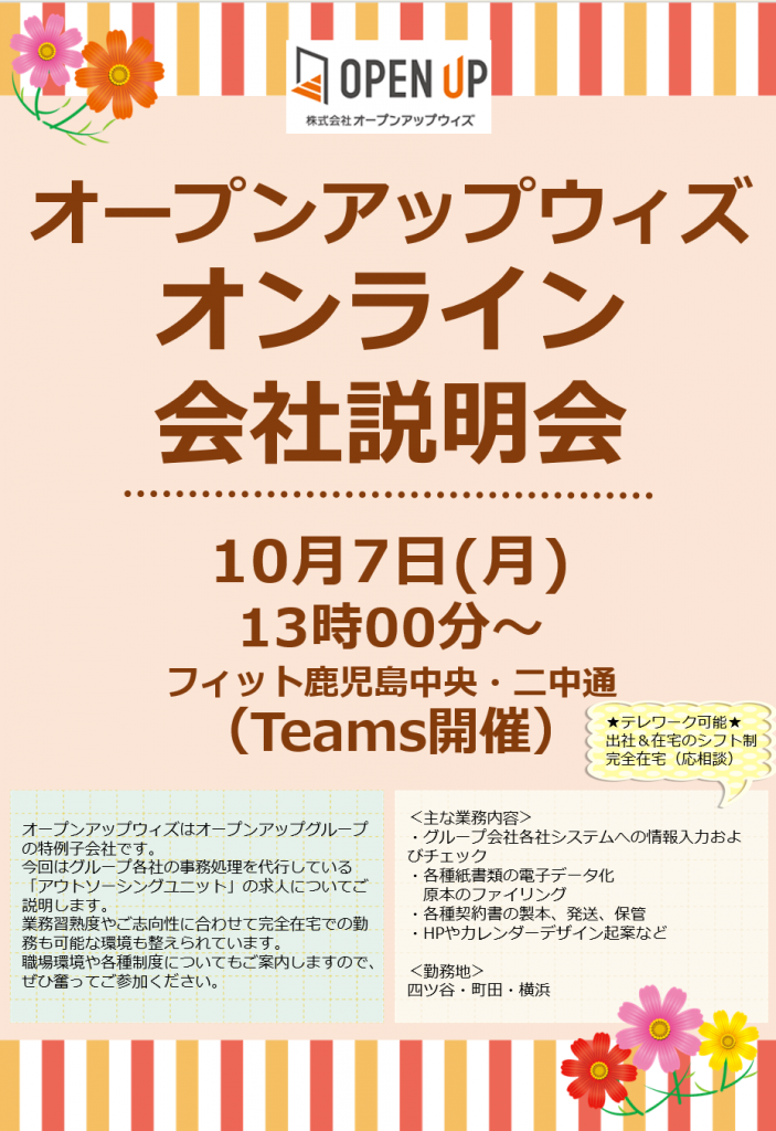 【2024年10月7日】オープンアップウィズの会社説明会が開催されます! | 鹿児島県鹿児島市の就労移行支援事業所 ティオ鹿児島中央・ティオ児島二中通(旧:フィット鹿児島中央・フィット鹿児島二中通)