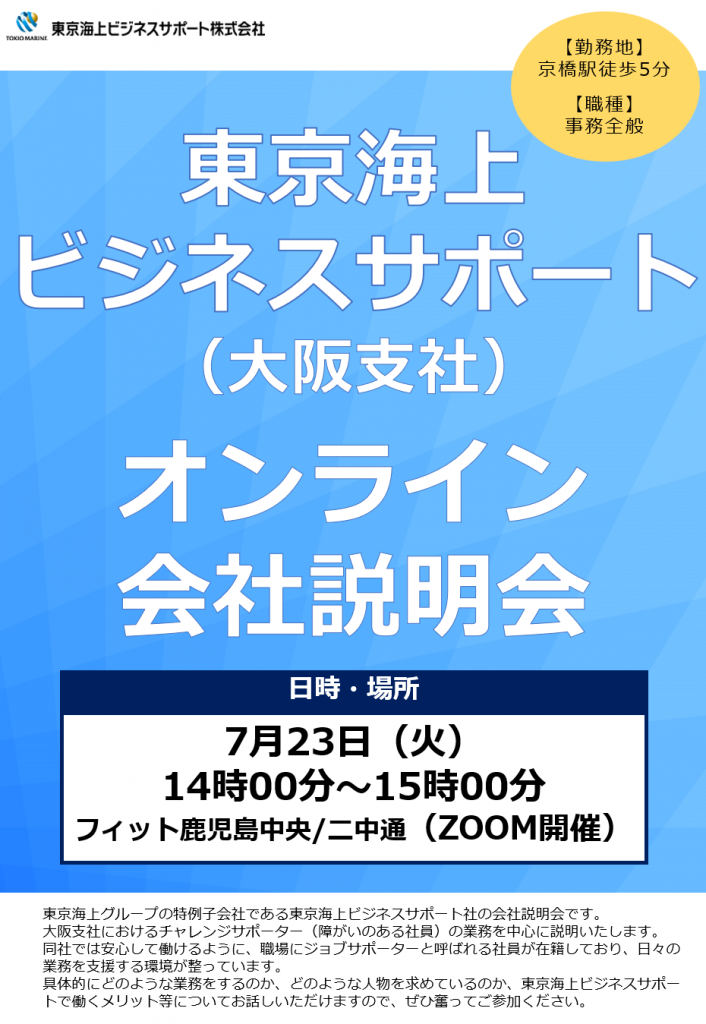【2024年7月23日】東京海上ビジネスサポートの会社説明会が開催されます!