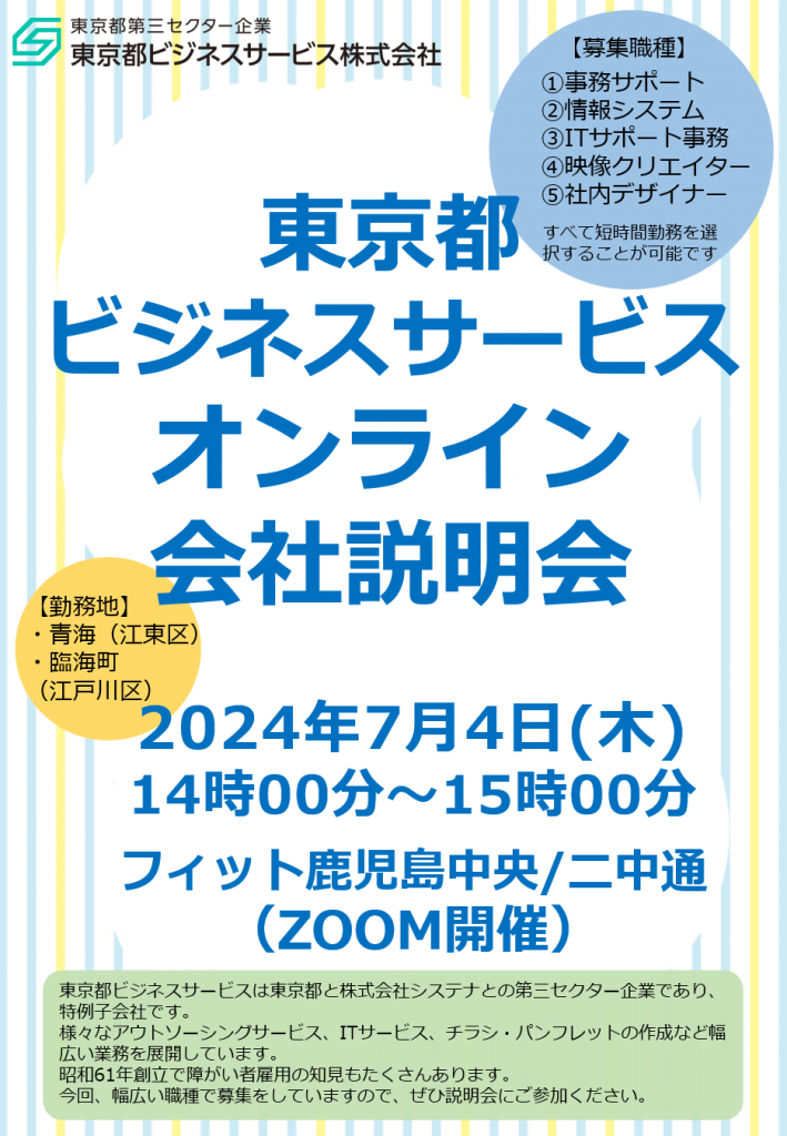 【2024年7月4日】東京都ビジネスサービス株式会社の会社説明会が開催されます!