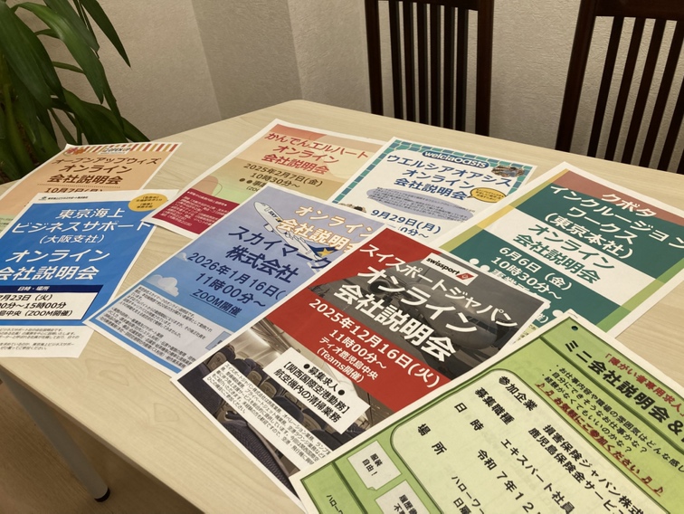 相談室の中には、ティオがこれまでに実施してきた過去の【事業所プログラム】の資料や、今後開催が予定されている全国の企業の【オンライン会社説明会】、ハローワーク鹿児島から案内のあった【鹿児島市内の会社説明会】の資料がファイルに収められています。