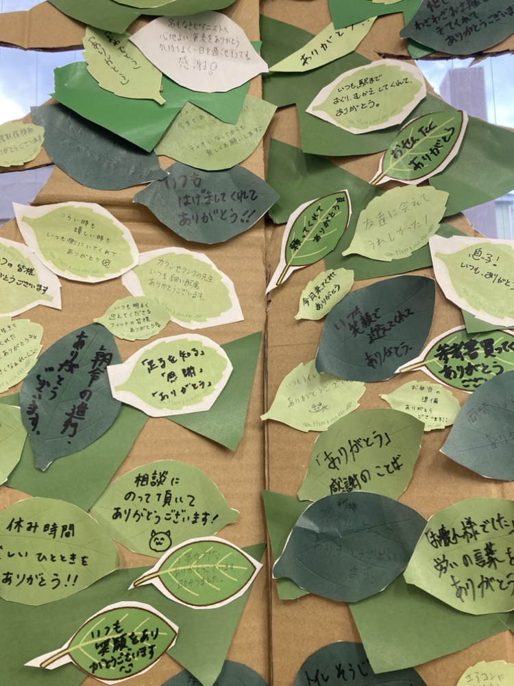11月から事業所内に設置し、利用者さんやスタッフが【ありがとうと感じた出来事】や【嬉しかった事】を文字に書いて土台の樹に張り付けて写真のように立派になりました。