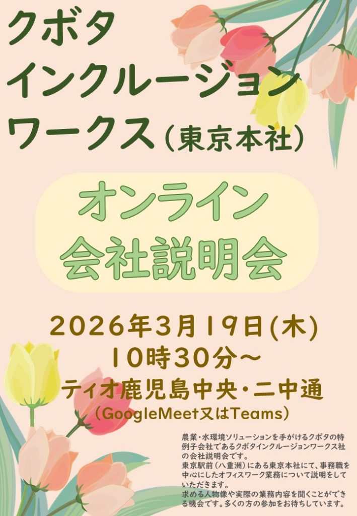 【2026年3月19日】クボタインクルージョンワークス(東京本社)会社説明会が開催されます!