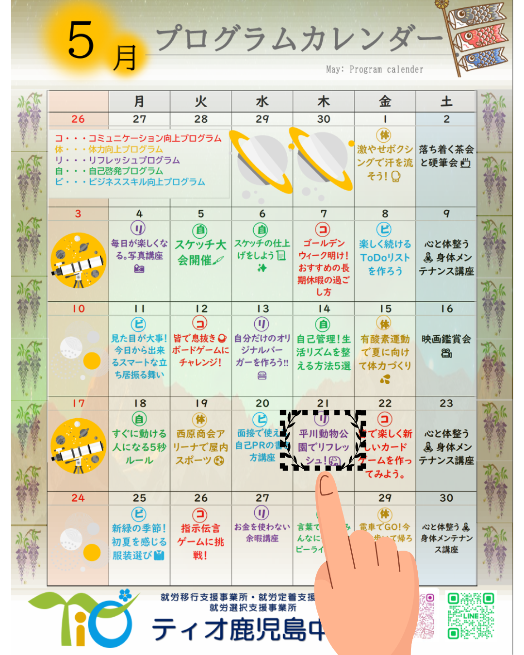 おすすめ:【リフレッシュプログラム】(例:5/21 平川動物公園でリフレッシュ!)