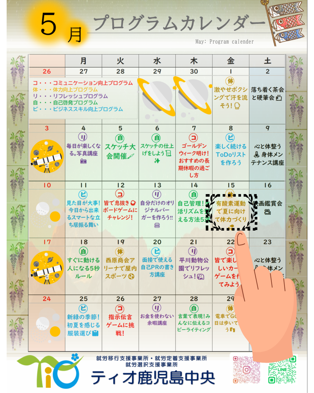 おすすめ:【体力向上プログラム】(例:5/15 有酸素運動で夏に向けて体力づくり)