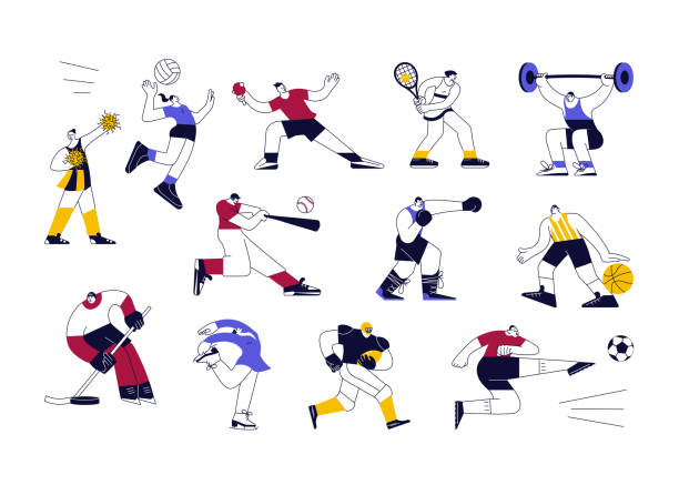 Set of male and female athletes. Team and Individual Sports characters isolated on white in modern outline minimalistic design. Flat Art Vector Illustration.