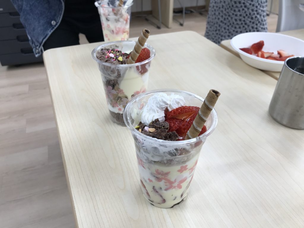 2日にいちご狩りで収穫したいちごを使い、パフェ作りをしました!