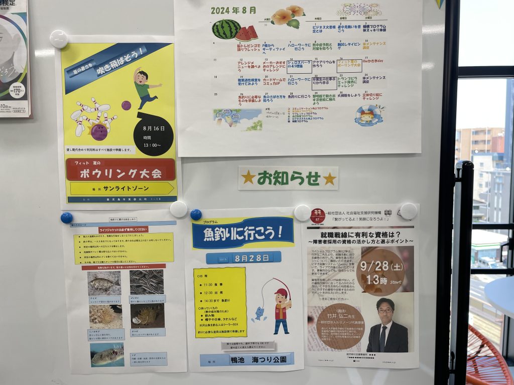 フィットでは8月、事業所外でのプログラムを計画しております。利用者の皆さんに持ち込んでいただく物や注意事項など、皆さんに事前にお知らせし、見通しを持ったイベントを実行するため、利用者さんにポスターを製作していただきました。