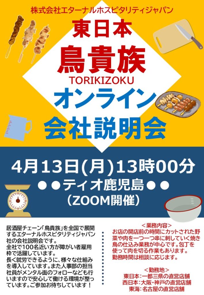 今回は、全国で居酒屋「鳥貴族」を運営するエターナルホスピタリティジャパン社の会社説明会です。